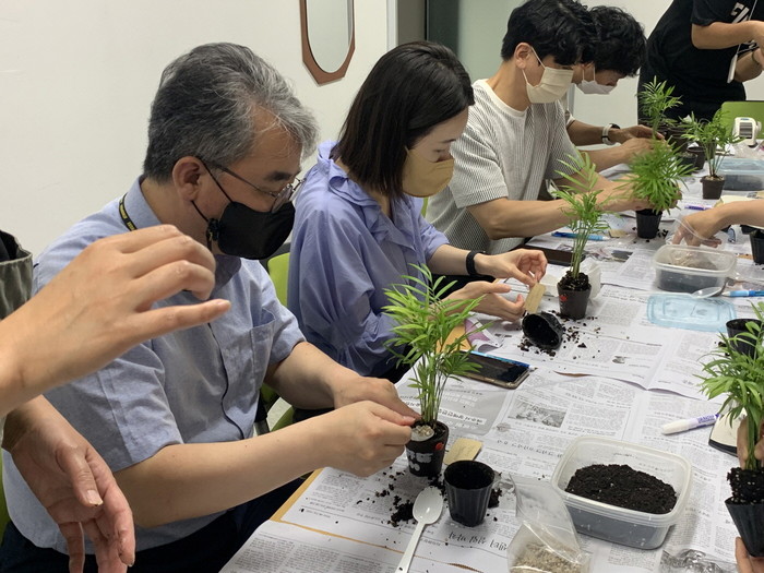 공기정화 식물인 테이블 야자와 임직원이 작성한 응원카드로 만들어진 『커피박 화분 반려식물』은 고양시대화노인복지관에 전달했다.
