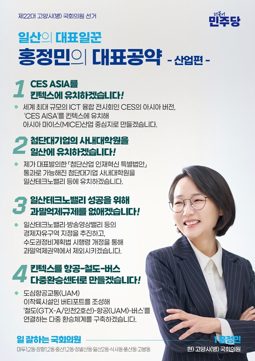 [부자동네타임즈 = 김인수 기자] 4.10 총선에서 재선에 도전하는 홍정민 국회의원(더불어민주당, 경기 고양병)이 일산 발전을 위한 3대 핵심 분야 12개 대표공약을 우선 발표했다.