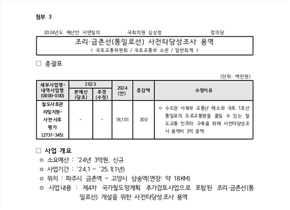 통일로선 용역비는 당초 정부가 국회에 제출한 예산안에는 포함되지 않았으나 이번 국회 예산심의 과정에서 심상정 의원의 적극적인 노력으로 반영되었다고 설명했다.