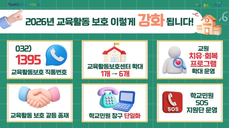 주요 내용으로는, 교육활동보호센터를 기존 1개에서 6개로 확대해 교육지원청별로 운영하고 전문 상담사를 배치해 학교 현장을 지원하며, 교육활동 보호 직통 번호(032-1395)를 운영해 교육활동 침해, 아동학대 피신고, 학교민원 및 특이민원 발생 시 신속하고 전문적인 상담과 법률 지원 등을 원스톱으로 제공한다.