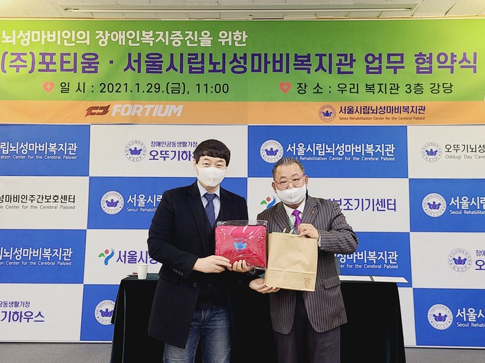 [부자동네타임즈 김인수기자] 서울시립뇌성마비복지관(관장 류영수, 이하 복지관)은 29일, 복지관 3층 강당에서 스포츠과학연구기업 ㈜포티움(대표 엄성흠, 이하 포티움)과 업무 협약을 체결했다.