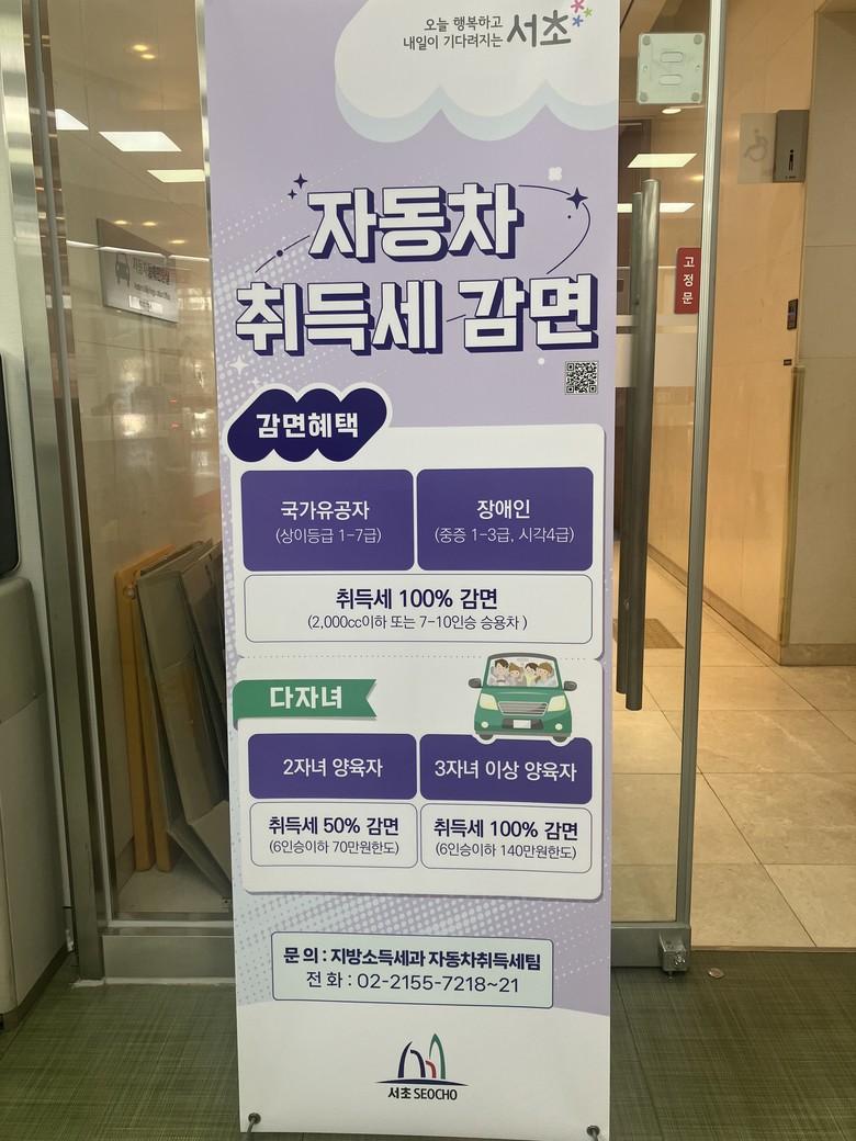 [부자동네타임즈=이평래 기자] 서울 서초구(구청장 전성수)가 차량취득세 감면 대상자의 알권리를 강화하고 납세자의 불이익을 사전에 막기 위해 구청 1층 자동차등록 민원실 입구에 '차량취득세 감면 홍보 배너'를 설치하고 안내에 나선다고 밝혔다.