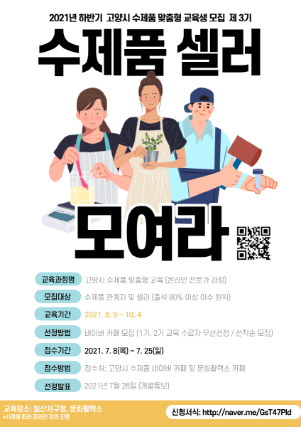 이번 교육의 모집대상은 고양시에 주민등록이 되어 있거나 사업장을 운영하는 수제품 작가 및 판매자이다. 신청은 오는 7월 25일까지 온라인으로 할 수 있다.