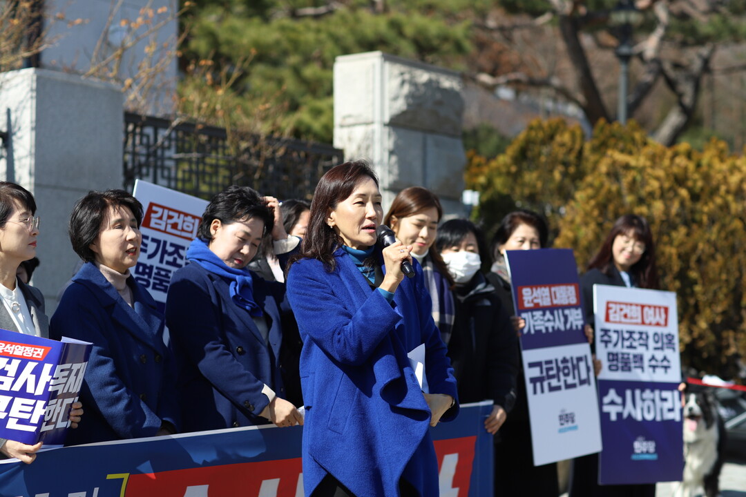 민주당의 윤은주 서초갑 여성위원장은 “검찰 총장 출신 윤 대통령은 살아있는 권력이라도 공정하게 수사해야 함을 친히 보여주었다”며 “대한민국 검찰은 공명정대하게 대통령 부인 김건희 여사에 관한 범죄 의혹을 낱낱이 파헤쳐”달라고 요청했다.