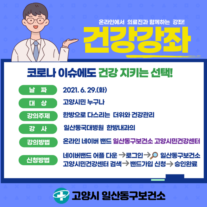 온라인 건강강좌의 주제는 ‘한방으로 다스리는 더위와 건강관리’로, 오는 6월 29일 오전 10시 네이버 밴드 ‘일산동구보건소 고양시민건강센터’에 강좌가 업로드 된다.