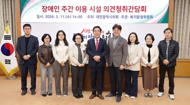 [부자동네타임즈=이영민 기자] 대전광역시의회 복지환경위원회는 11일 시의회 3층 소통실에서 이효성 의원(국민의힘, 대덕구1) 주재로 「장애인 주간 이용시설 의견청취 간담회」를 개최했다.