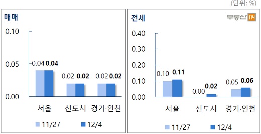 4일 부동산114에 따르면 12월 첫째 주 서울 아파트 매매가격 상승률은 지난주와 동일한 0.04%를 기록했다.