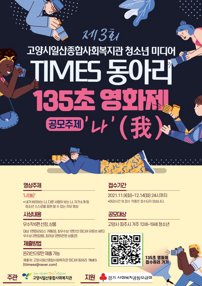 [부자동네타임즈 김인수기자] 고양시 일산종합사회복지관(관장 양성필)이 12세~19세 청소년을 대상으로 ‘135초 영화제-나(我)’ 영상 공모전을 개최한다.