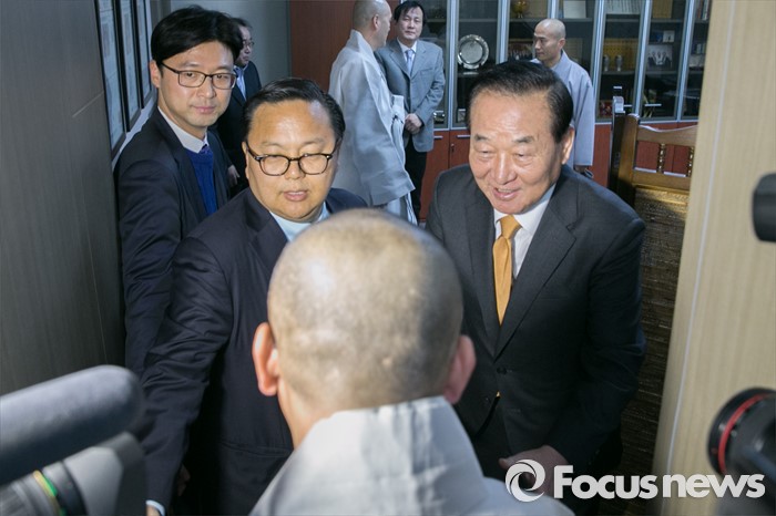 (서울=포커스뉴스) 19일 오후 서울 여의도 국회 의원회관에서 서청원(오른쪽) 새누리당 최고위원이 자신의 집무실을 방문한 조계사 부주지 담화 스님을 비롯한 스님들을 맞이하고 있다. 조계종은 이날 오전 서 최고위원이 당 최고위원회의에서 "조계종이 민주노총 한상균 위원장을 보호하면 국민에게 대접 받지 못할 것”이라고 발언한 것과 관련해 사과를 요구했다.