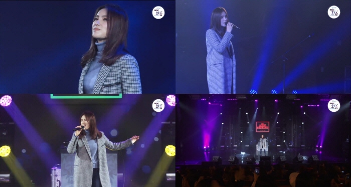 △ 가수 거미가 10일 오후 8시 상암 MBC 골든 마우스 홀에서 개최한 ‘MBC 화요 음악회 with 타블로와 꿈꾸는 라디오’ 공개방송에서 라이브 무대를 선보이는 모습. <사진제공=MBC ‘화요 음악회’ 공개방송 캡처>