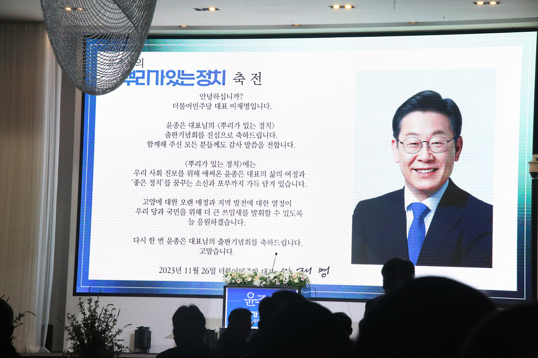 더불어민주당 대표 이재명는 "안녕하십니까? 더불어민주당 대표 이재명입니다. 윤종은 대표님의 뿌리가 있는 정치 출판기념회를 진심으로 축하드립니다. 함께해 주신 모든 분들께도 감사 말씀을 전합니다. 뿌리가 있는 정치에는 우리 사회 진보를 위해 애써온 윤종은 대표의 삶의 여정과 ‘좋은 정치’를 꿈꾸는 소신과 포부까지 가득 담겨 있습니다. 고양에 대한 오랜 애정과 지역 발전에 대한 열정이 우리 당과 국민을 위해 더 큰 쓰임새를 발휘할 수 있도록 늘 응원하겠습니다. 다시 한 번 윤종은 대표님의 출판기념회를 축하드립니다. 고맙습니다."축사를 서면으로 전했다.