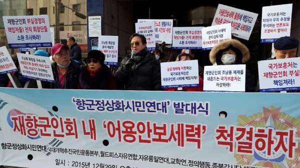[부자동네타임즈 김정태 기자] 29일 4대개혁추진국민운동본부, 월드피스자유연합, 자유통일연대 등 이루어진 향군정상화시민연대가 ‘재향군인회 내 어용안보세력 척결하자!’는 기치를 내걸고 성수동 재향군인회 앞에서 발대식을 선포하는 기자회견을 개최했다.