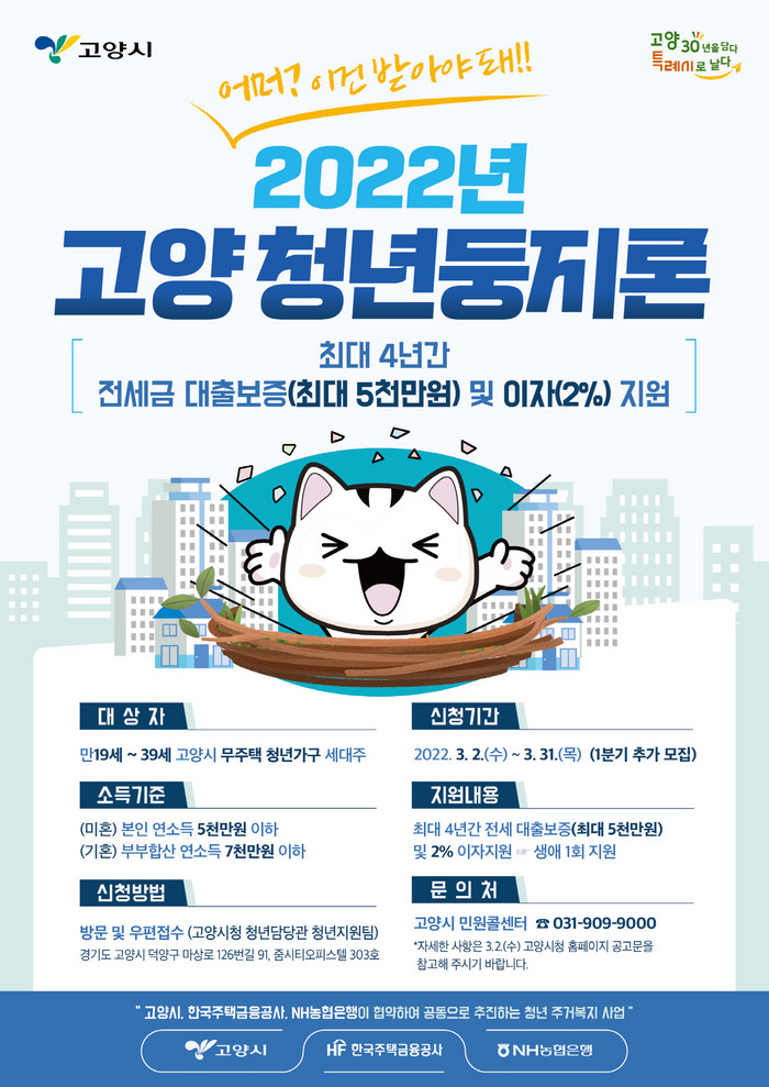 [부자동네타임즈 김인수기자] 고양시가 3월 2일부터 ‘고양 청년둥지론’ 사업의 1분기 지원가구 미달분에 대한 추가모집을 진행한다.