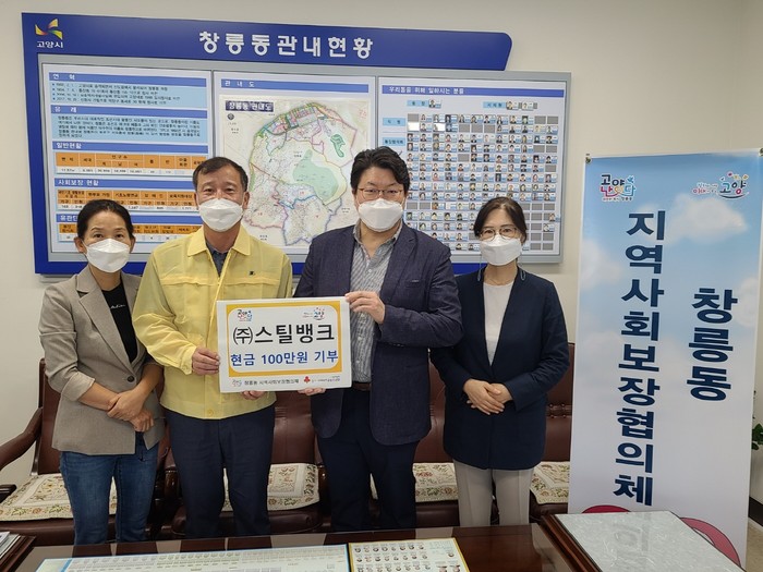 [부자동네타임즈 김인수기자] 고양시 덕양구 창릉동(동장 이병영)은 "지난 8일, ㈜스틸뱅크(대표 문준석)로부터 관내 취약계층 자립지원 후원금 100만원을 전달 받았다."고 밝혔다.