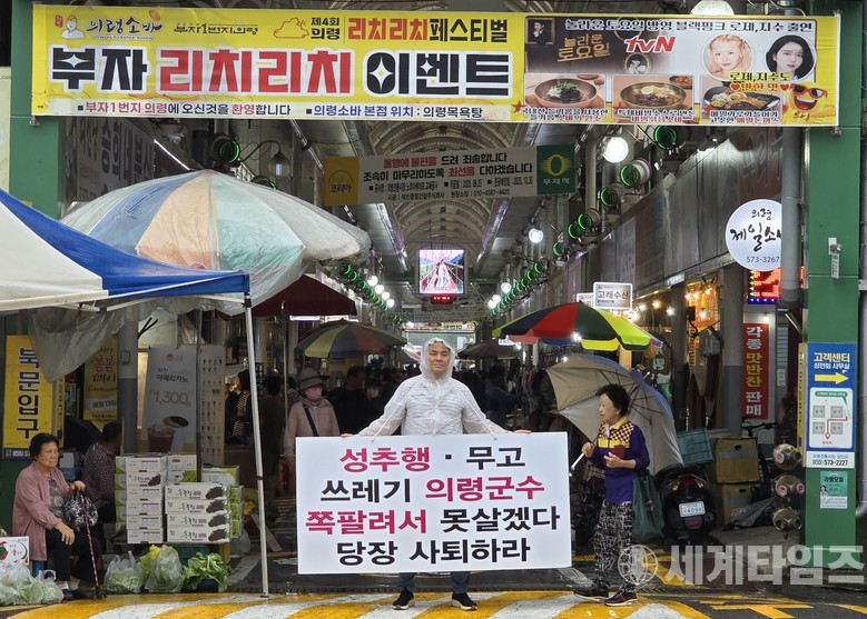 피켓에는 ‘성추행·무고 쓰레기 의령군수 쪽팔려서 못 살겠다 당장 사퇴하라’는 문구가 적혀 있다.