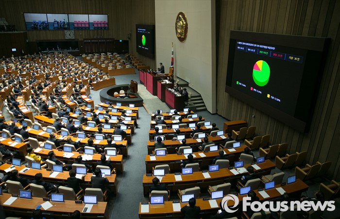 △ 30일 오후 서울 여의도 국회에서 열린 337회 국회(정기회) 12차 본회의에서 대한민국 정부와 중화인민공화국 정부 간의 자유무역협정 비준동의안(한중 FTA 비준동의안)이 재석 265중 찬성 196인, 반대 33인, 기권 36인으로 통과되고 있다. <사진제공=포커스뉴스>