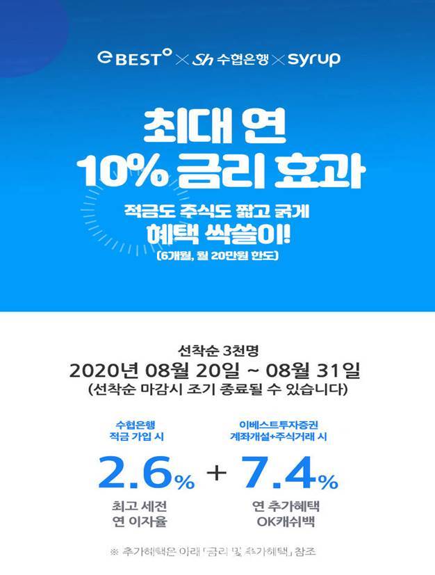 오는 31일까지 진행되는 이번 이벤트는 ▲SK플래닛의 ’시럽 월랫’ 앱에서 ‘잇정기적금(제휴)’을 6개월 만기로 가입하고 ▲이베스트투자증권에서 생애 최초로 신규계좌 개설 및 주식거래 ▲12월 28일까지 적금납입금 4회차(신규납입 포함)이상 납입 등의 세가지 조건(미션)을 충족하면 최대 연 2.6% 금리에 연 7.4% 상당의 OK캐쉬백을 추가로 받을 수 있어 최대 연 10%의 금리효과를 누릴 수 있다.