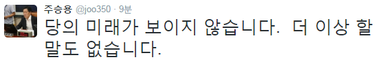 주 최고위원은 이날 자신의 SNS 계정을 통해 "당의 미래가 보이지 않는다"면서 "더 이상 할 말도 없다"고 밝혔다.