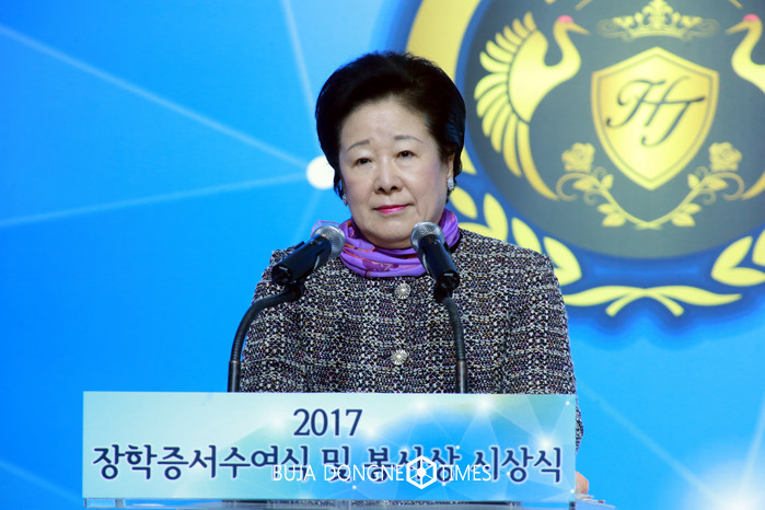 5일 오후 경기도 가평 청심국제청소련수련원 대강당에서 열린 ‘재단법인 효정세계평화재단 2017 장학증서 수여식 및 봉사상 시상식’에서 한학자 총재가 특별강연을 하고 있다. 이날 행사에는 전체 장학생을 대표하여 한국, 미국, 영국, 독일, 프랑스, 오스트리아, 브라질, 멕시코, 니카라과, 일본, 대만, 네팔, 말레이시아, 호주, 뉴질랜드, 솔로몬 제도, 러시아, 루마니아, 시리아, 이스라엘, 가나, 르완다, 우간다, 잠비아, 카메룬 등 전 세계에서 88개국 800여명의 학생수여자들이 참석했다. 2017.02.05.(사진=재단법인 효정세계평화재단 제공)