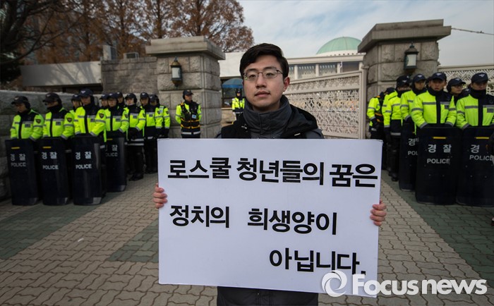 | △ 사법시험 존폐에 관한 논쟁이 격화되고 있는 가운데 지난 9일 오전 서울 여의도 국회 앞에서 서울대학교 로스쿨 2학년에 재학 중인 강태승씨가 '사법시험 폐지 유예 철회' 1인 시위를 하고 있다. <사진제공=포커스뉴스> |