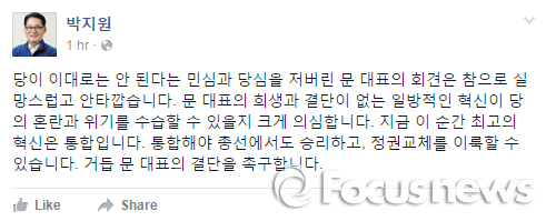 박 의원은 문 대표의 기자회견 직후 자신의 페이스북을 통해 "문 대표의 희생과 결단이 없는 일방적인 혁신이 당의 혼란과 위기를 수습할 수 있을지 크게 의심한다"고 밝히며 이같이 말했다.