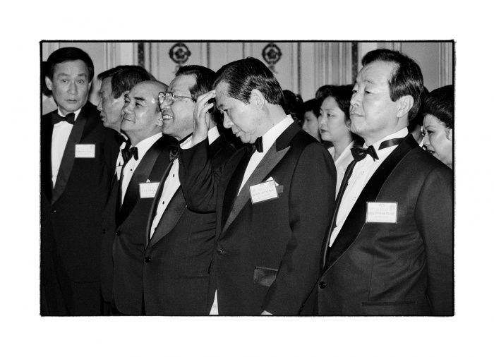 △90년 3당합당 후,한 행사장에 참석한 민자당 대표최고위원 시절의 김영삼 전 대통령 (오른쪽 끝)이 당시 김대중 평민당 총재와 김종필, 박태준 민자당 최고위원 등. <사진제공=최재영 사진가>