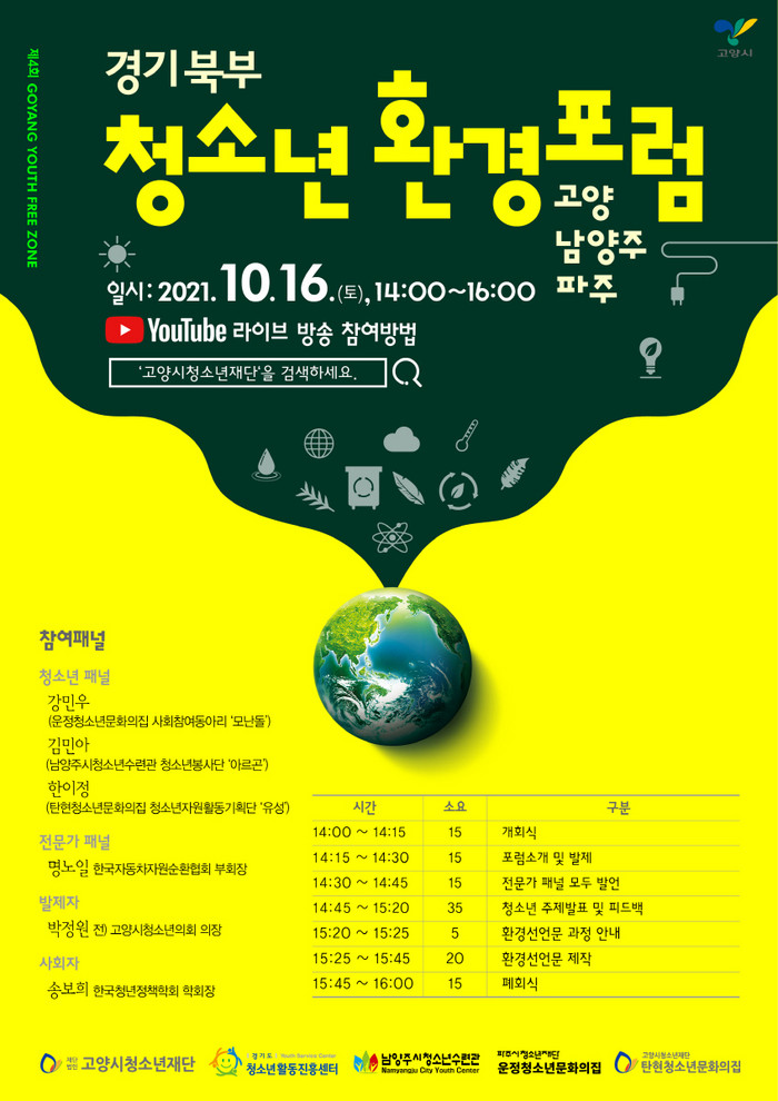 이번 포럼은 고양시청소년재단 유튜브를 통해 실시간 방송되며, 환경에 관심 있는 청소년이면 누구나 시청할 수 있다. 2차 토론은 ’가평군, 의정부시, 포천시‘ 청소년을 중심으로 오는 10월23일(토)에 진행될 예정이다.