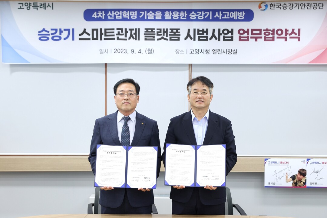[부자동네타임즈 = 김인수 기자] 고양시청에서 한국승강기안전공단(이하 공단)과 승강기 사고 예방을 위한 업무 협약을 체결했다. 업무 협약식에는 이동환 고양특례시장, 이용표 공단 이사장을 포함하여 양 기관 관계자가 참석했다.