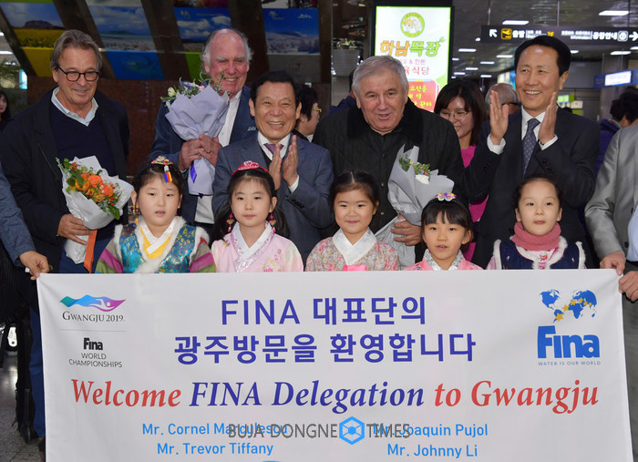 윤장현 광주광역시장이 15일 오후 광주공항에서 '2019 광주세계수영선구권대회' 경기장 점검을 위해 국제수영연맹(FINA) 대표단과 기념촬영을 하였다. 와킨 푸욜 시설위원장, FINA 임시풀 후원사인 밀씨풀의 임원 트레버 티파니, 코넬 마르쿨레스쿠 FINA 사무총장, 조영택 광주 세[계수영선수권대회 조직윈회 사무총장이 함께 하였다.