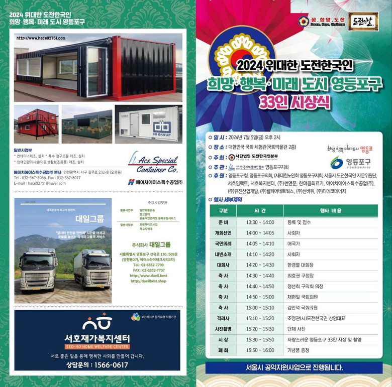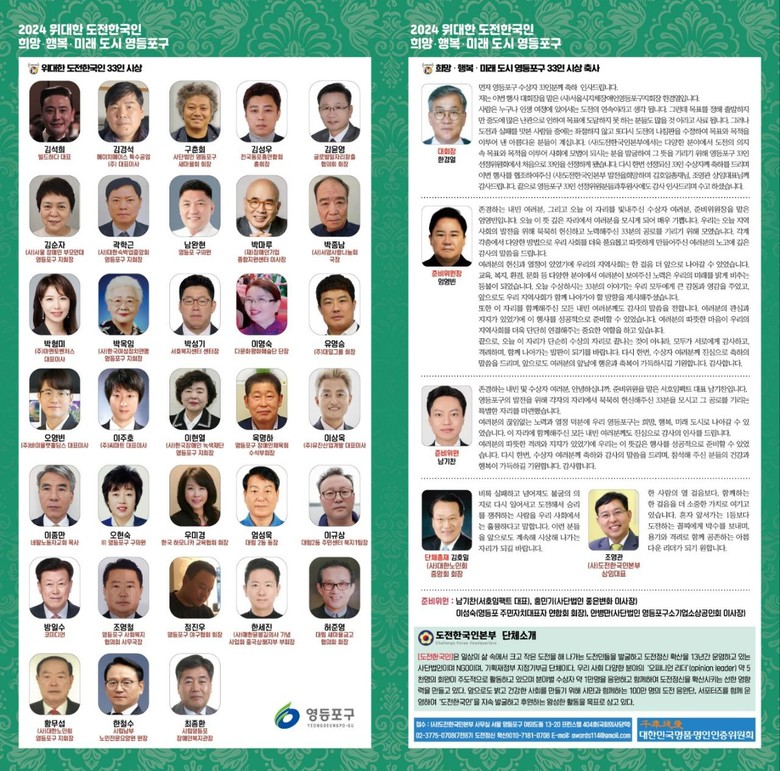 (사)도전한국인본부(상임대표 조영관)가 오는 7월 5일(금) 오후 2시 대한민국 국회 체험관(국회박물관 2층)에서 영등포구 도전한국인 수상자 발표회 및 시상식을 개최한다. 이번 행사는 '2024 위대한 도전한국인 희망 행복 미래 도시 영등포구'라는 주제로 개최하며 (사)서울시지체장애인협회 영등포구지회와 (사)대한노인회 영등포구지회가 공동 주관한다.