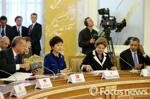 | △ 박근혜 대통령을 비롯한 각국 정상들이 2013년 9월 5일 러시아 상트페테르부르크 콘스탄틴 궁전에서 열린 G20 정상 워킹 세션에서 회의에 임하고 있다. <사진출처=청와대> |