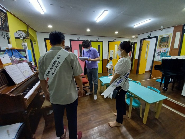 [사진설명] 지난 7월 14일 학원방역 특별점검에 학원연합회 회원이 참여하고 있다.