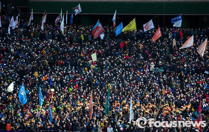 | △ 지난 5일 오후 서울 시청 앞 광장에서 열린 제2차 민중총궐기대회에 집회 참가자들이 집결해 있다. <사진제공=포커스뉴스> |