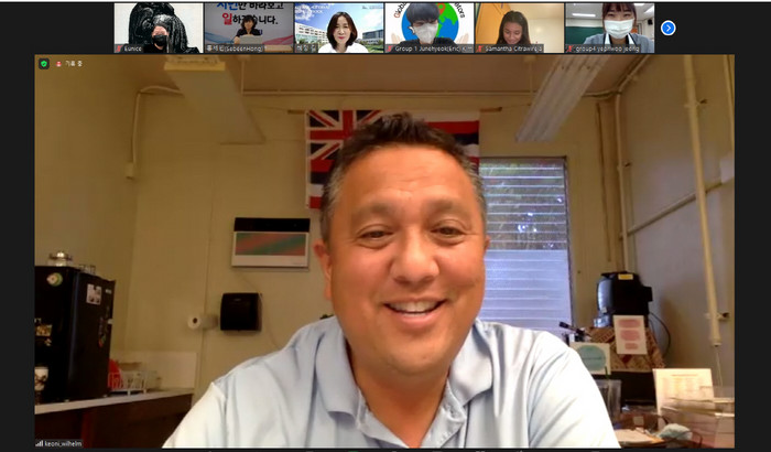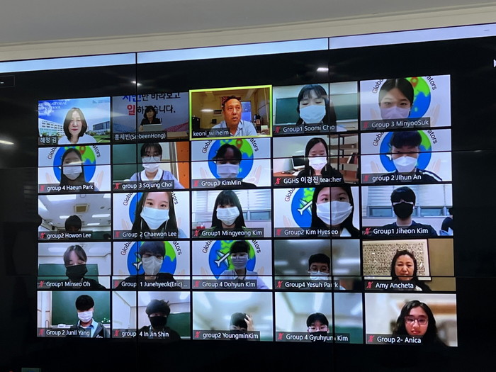 온프렌즈 교류 1차 프로그램은 지난 6일 진행됐다. 1차에서는 마우이 볼드윈고등학교 교장, 교감, 담당교사와 학생 16명, 고양국제고등학교 교장, 국제교육부장, 담당교사와 학생 22명이 온라인으로 만나 인사를 나눴다.