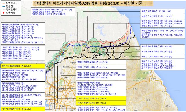 국립환경과학원은 3월 8일 폐사체 5개체에서 아프리카돼지열병 바이러스를 확진하고 결과를 관계기관에 통보했다. 이로써 화천군 130건, 연천군 103건, 파주시 70건, 철원군 22건, 총 325건의 멧돼지 아프리카돼지열병이 확진됐다.