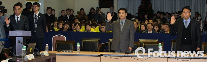| △ 14일 오전 서울 중구 서울YWCA에서 열린 '4·16세월호참사 특별조사위원회 제1차 청문회'에서 이춘재(왼쪽부터) 해양경찰청 경비안전국장, 유연식 서해지방해양경찰청 상황담당관, 조형곤 목포해양경찰서 경비구난과 상황담당관이 증인선서를 하고 있다. <사진제공=포커스뉴스> |