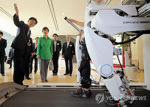 | △ 전시물 참관하는 박 대통령 (서울=연합뉴스) 이정훈 기자 = 박근혜 대통령이 17일 오전 서울 성북구 화랑로 한국과학기술연구원(KIST)에서 열린 제11차 국가과학기술자문회의에서 바이오 인터페이스 기반 보행재활 시스템을 살펴보고 있다. 2014.7.17 uwg806@yna.co.kr |