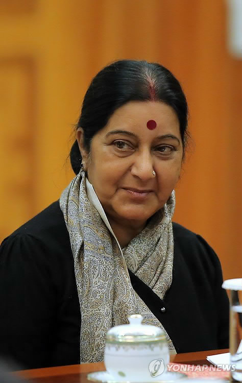 (뉴델리=연합뉴스) 나확진 특파원 = 수슈마 스와라지 인도 외교장관이 버락 오바마 미국 대통령이 자국을 방문하고 떠난 지 4일 만인 지난달 31일 오후(중국시간) 중국을 방문했다.