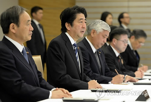 | △ 테러에 절대 굴복 안합니다 (AP/교도통신=연합뉴스) 1일(현지시간) 이슬람 수니파 원리주의 무장단체 이슬람국가(IS)가 언론인인 고토 겐지(後藤健二·47) 살해 주장 영상을 인터넷에 올린 가운데 도쿄 총리 관저에서 아베 신조(安倍晋三, 왼쪽 2번째) 총리가 긴급 각료회의를 주재하고 있다. 아베 총리는 "일본은 절대 테러에 굴복하지 않을 것"이라며 "테러와 싸우는 국제사회에서 일본의 책임을 다할 것"이라고 강조했다. bulls@yna.co.kr |