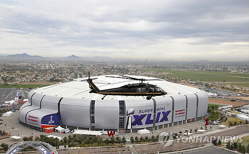 | △ '슈퍼볼' 철통 경비 (AP=연합뉴스) 2일(현지시간) '디펜딩 챔피언' 시애틀 시호크스와 뉴잉글랜드 패트리어츠 간에 2014-2015 미국프로풋볼(NFL) 챔피언 결정전(슈퍼볼)이 열릴 애리조나 주 글렌데일의 피닉스대학교 주경기장 위로 지난달 26일 미관세국경보호청 소속 블랙호크 헬기가 날고 있다. |