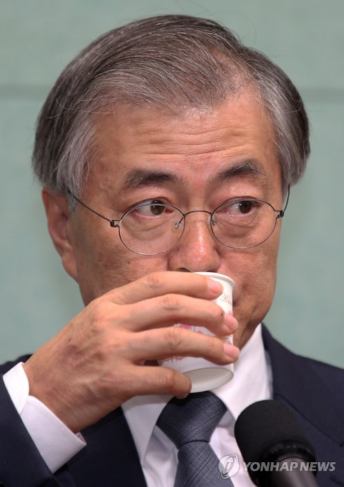 | △ 물 마시는 문재인 후보 (전주=연합뉴스) 최영수 기자 = 문재인 새정치민주연합 당대표 후보가 2일 오전 전북도의회에서 기자회견을 하는 도중 물을 마시고 있다. |