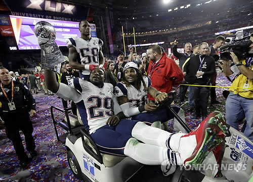 △ 뉴잉글랜드, 10년 만에 '슈퍼볼' (AP=연합뉴스) 1일(현지시간) 미국 애리조나주 글렌데일의 피닉스대학 주경기장의 49회 미프로풋볼(NFL) 챔피언 결정전(슈퍼볼)에서 시애틀 시호크스를 꺾고 우승한, 뉴잉글랜드 패트리어츠의 러닝백 르개리트 블라운트(앞쪽)가 롬바르디 트로피를 들고 기뻐하고 있다. 뉴잉글랜드는 이날 4쿼터 막판 신인 세이프티 말콤 버틀러의 극적인 인터셉션에 힘입어 시애틀을 28-24(0-0 14-14 0-10 14-0)로 누르고 극적인 드라마를 연출했다. 이로써 뉴잉글랜드는 2002년, 2004~2005년에 이어 통산 네 번째로 슈퍼볼 정상을 밟았다. bulls@yna.co.kr New England Patriots running back LeGarrette Blount (29) holds up the Vince Lombardi Trophy as he celebrates with his teammates after the Patriots defeated the Seattle Seahawks 28-24 in NFL Super Bowl XLIX football game Sunday, Feb. 1, 2015, in Glendale, Ariz. (AP Photo/Mark Humphrey)