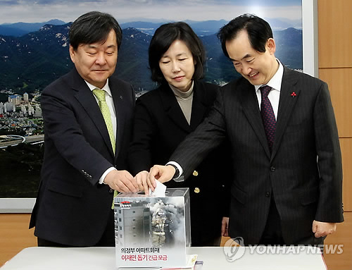 | △ 을지재단 산하기관 직원 의정부 화재 성금 1억원 전달 (의정부=연합뉴스) 홍성희(가운데) 을지재단 이사장과 조우현(왼쪽) 을지대 총장이 3일 경기도 의정부시청 1층에 마련된 희망브릿지 전국재해구호협회 모금 창구를 찾아 재단 산하 대학과 병원 직원들이 모은 화재 피해 주민 돕기 성금 1억원을 내고 있다. 2015.2.3 <<의정부시 제공>> kyoon@yna.co.kr |