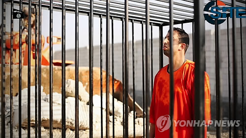 △ IS, 요르단 조종사 살해 (AP/시테 인텔리전스 그룹=연합뉴스) 수니파 원리주의 무장단체 '이슬람국가'(IS)는 지난해 12월 생포한 요르단 조종사 마즈 알카사스베(26) 중위를 살해하는 영상을 3일(현지시간) 공개했다. 22분짜리 이 영상은 오렌지색 죄수복을 입은 마즈 중위가 야외에 설치된 철창에 갇힌 채 불길에 휩싸여 사망하는 장면을 보여줬다. 사진은 테러·극단주의 감시단체 '시테'(SITE) 사이트에 실린 이날 영상에서 캡처한 마즈의 모습.