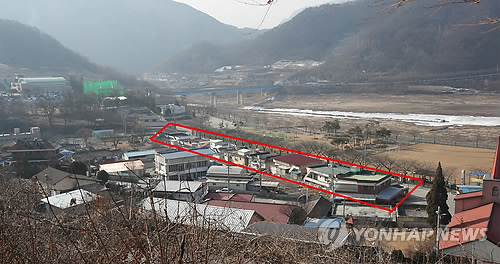 △ 30여년간 쇠퇴의 길 걷고 있는 구단양 (제천=연합뉴스) 전창해 기자 = 일명 '구단양'으로 불리는 충북 단양군 단성면 일대는 1985년 충주댐 건설 이후 군청 소재지가 지금의 '신단양'(단양읍)으로 옮겨가면서 급속히 쇠락의 길을 걷기 시작했다. 사진은 단성면 상가지역 전경. 붉은색으로 표시된 상가건물이 30여년간 '댐 저수구역' 규제에 묶여 이 일대 개발을 막고 있다. 2015.2.4 jeonch@yna.co.kr
