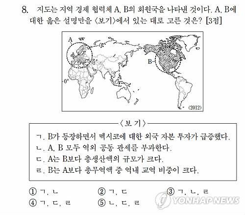 △ 2014학년도 대학수학능력시험 세계지리 8번 문항 (연합뉴스 자료사진)