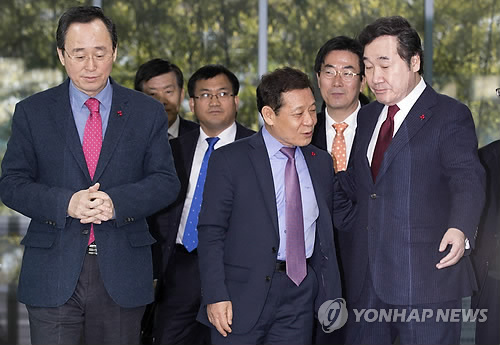 △ 서승환 장관과 면담 마친 후 국토부 나오는 호남·충청권 시장도지사 (서울=연합뉴스) 윤동진 기자 = 서승환 국토교통부 장관과 면담을 마친 송하진 전북지사(왼쪽부터), 윤장현 광주시장, 설문식 충북정무부지사, 이낙연 전남지사가 3일 오후 서울 서초구 국토교통부 사무실을 나서고 있다. 이들은 이날 서 장관을 만나 KTX 서대전역 경유의 부당성을 지적하며 'KTX 노선 원안 운행'을 촉구했다. 2015.2.3 mon@yna.co.kr