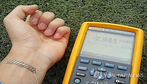 | △ KAIST 전기 및 전자공학과 조병진 교수 연구팀이 개발한 '웨어러블(Wearable) 발전소자(체온 전력 생산기술)'가 유네스코가 선정한 '세상을 바꿀 10대 기술' 대상에 올랐다. 사진은 조 교수 연구팀이 개발한 웨어러블 발전소자를 시연하는 모습. ( KAIST 제공) |