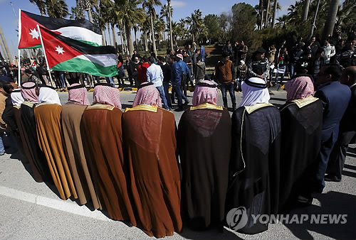 | △ 요르단, 'IS와 가차없는 전쟁' (AP=연합뉴스) 요르단 수도 암만의 퀸 알리아 공항 밖에서 요르단 인사들이 압둘라 2세 국왕의 도착을 기다리며 정부의 테러 대응에 대해 지지를 표시하고 있다. 방미중 이슬람국가(IS)의 공군 조종사 마즈 알카사스베(26) 중위 화형 소식에 접한 압둘라 국왕은 이날 급거 귀국해 "순교자 알카사스베의 피는 헛되지 않을 것이며 요르단과 우리 군은 더 단호할 것"이라면서 테러에 대한 강경한 대응을 재차 천명했다. bulls@yna.co.kr |