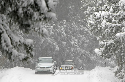 | △ 눈으로 덮인 제주 산간 도로 <<연합뉴스DB>> |